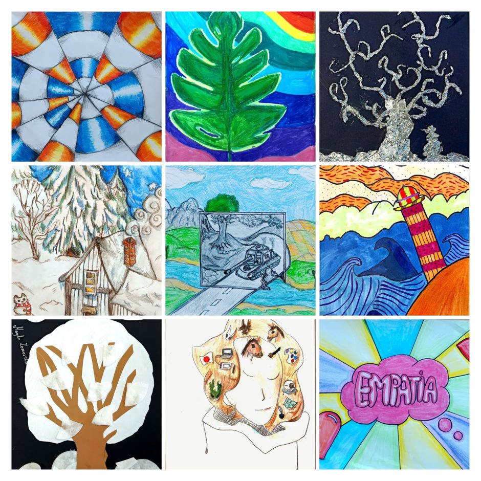 W galerii można odnaleźć zimowe pejzaże malowane w wąskiej gamie barwnej, drzewa przedstawione w różnych technikach, frotażowe choineczki świąteczne, dzieła inspirowane sztuką op-art oraz pop-artowe napisy przygotowane z okazji Międzynarodowego Dnia Tolerancji. Są też „wewnętrzne portrety” uczniów, pełne symboli i znaczeń, powakacyjne i jesienne kompozycje tworzone z linii, a także bardzo poruszające prace wyrażające sprzeciw wobec wojen toczących się na świecie.