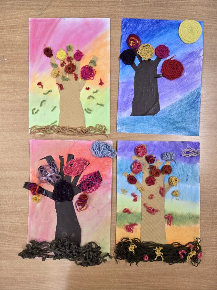 Podczas dzisiejszych porannych zajęć plastycznych chętni wykonali jesienne drzewa. Dzieci miały do dyspozycji takie materiały plastyczne, jak bibuła, papier, kolorowe włóczki, a także suche pastele.