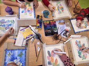Podczas porannych zajęć w świetlicy malowaliśmy akwarelami kolorowe kaktusy. Po wyschnięciu farby „ozdabialiśmy” je fantazyjnymi wzorami przy użyciu flamastrów.