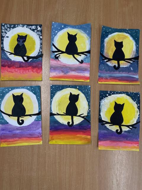 Podczas dzisiejszych, porannych, cyklicznych zajęć plastycznych, dzieci malowały farbami akrylowymi. Tworzyły kolorowe, wielobarwne warstwy przenikających się kolorów zachodzącego słońca. Wraz z panią Agnieszką Gałan przygotowałyśmy w kubeczkach farby a dzieci na paletach mogły je mieszać, aby uzyskać swoje odcienie czy kolory. Chętnie malowały pędzlem ale też palcami. Po wysuszeniu prac naklejały gałązki oraz kota. Tak powstały piękne wielobarwne prace!