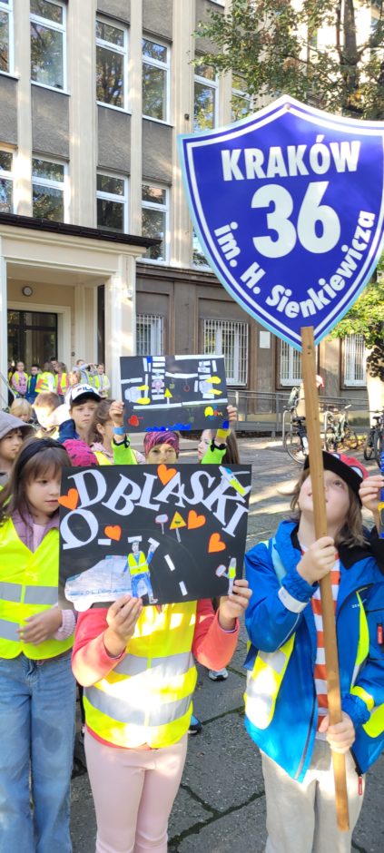 Klasy II i III wzięły udział w przemarszu „Pieszo do celu”, organizowanym przez Wydział Ruchu Drogowego KM Policji. Wydarzenie to odbyło się przy współpracy ze Strażą Miejską Miasta Krakowa, Miejskim Przedsiębiorstwem Komunikacyjnym S. A. w Krakowie, Stowarzyszeniem Dorożkarzy Krakowskich oraz Państwową Strażą Pożarną. Celem przedsięwzięcia było zwrócenie uwagi na konieczność noszenia elementów odblaskowych, które zapewniają widoczność. Uczniowie krakowskich szkół wyruszyli trasą z Błoń, Aleją Krasińskiego na Wzgórze Wawelskie, a stamtąd ul. Grodzką przez Rynek Główny do Barbakanu. Wszyscy uczestnicy byli ubrani w kamizelki odblaskowe, posiadali przy sobie przygotowane wcześniej transparenty oraz wykonane własnoręcznie znaki drogowe informujące jak ważne jest używanie odblasków, aby być bezpiecznym na drodze. Dzieciom towarzyszyły maskotki Policji, Straży Miejskiej i MPK, a także krakowskie dorożki i hejnalista ze Straży Pożarnej. Udział w tym wydarzeniu był również elementem promocji idei konkursu „Odblaskowa Szkoła”. Galeria 1