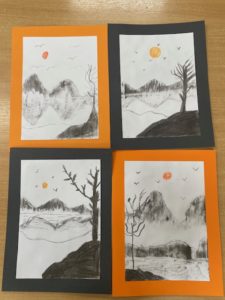 Podczas ostatnich cyklicznych zajęć plastycznych, które odbywają się w każdą środę, dzieci rysowały węglem. Rysunek węglem to jedna z najstarszych i najbardziej efektownych technik artystycznych, która sprawia, że każdy artysta, niezależnie od poziomu zaawansowania, może uzyskać wyraziste i pełne głębi prace. Węgiel, jako medium rysunkowe, pozwala na uzyskanie szerokiego spektrum tonów – od niezwykle delikatnych szarości aż po intensywnie czarne, głębokie cienie. Dzięki temu rysunek węglem doskonale oddaje faktury, światłocienie i trójwymiarowość przedstawianych obiektów. Naszym tematem były góry i próba uzyskania ich odbicia w jeziorze. Dzieci wydzierały z papieru zarysy górskiego krajobrazu i po przyłożeniu do kartki zarysowywały granice obrysu węglem. Po obróceniu kartki uzyskiwały linie odbicia lustrzanego. Teraz wystarczyła gumka do mazania, którą wytyczały linię brzegową jeziora. Tak powstały piękne prace. Link do zdjęć https://photos.app.goo.gl/AzFstRU1FVSMNCWf8