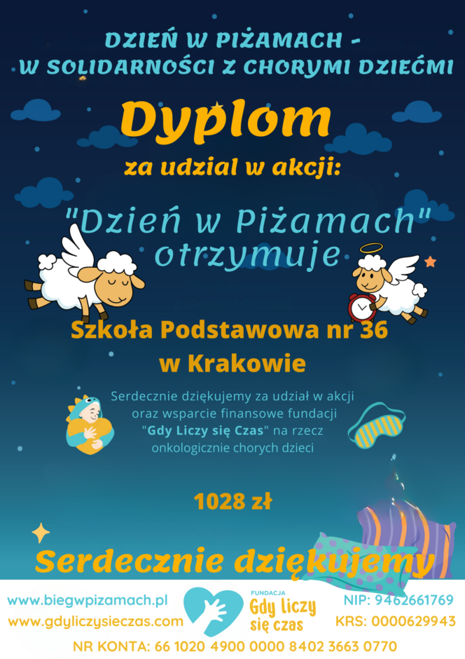 Wkładamy piżamy i okazujemy solidarność z dziećmi z oddziałów onkologicznych. W tym dniu prowadzimy też zbiórkę dla Fundacji „Gdy liczy się czas”, tworzymy klasowe Kodeksy Życzliwości i pozdrawiamy innych na Tablicy Życzliwości i Pozdrowień!