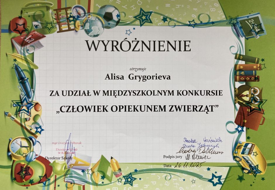 Alisa Grygorieva z klasy 1A zdobyła Wyróżnienie w międzyszkolnym konkursie plastycznym: „Człowiek opiekunem zwierząt”. Organizatorem konkursu jest Szkoła Podstawowa nr 40 w Krakowie. Alisa otrzymała dyplom i nagrodę od organizatorów. Gratulujemy! 🙂